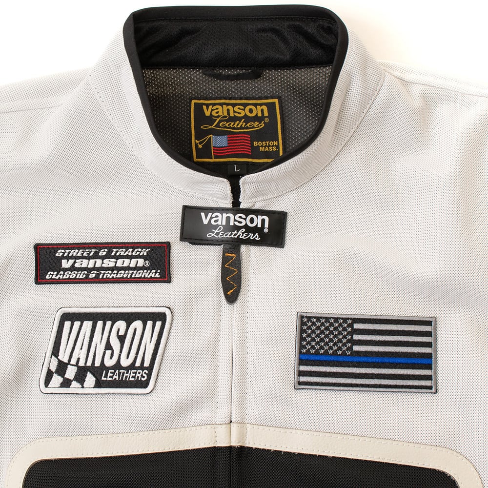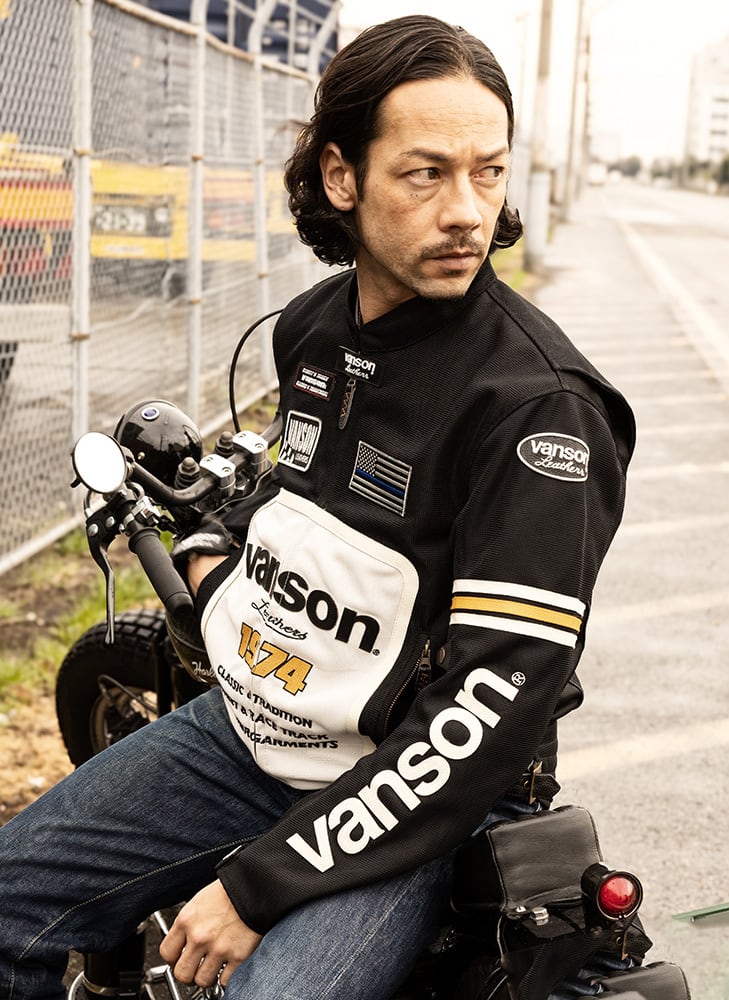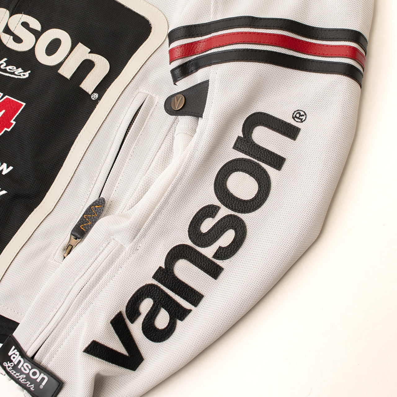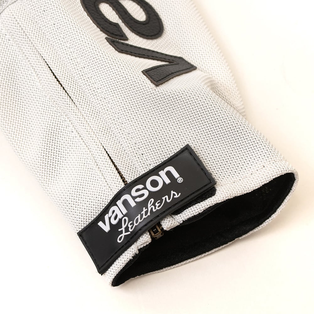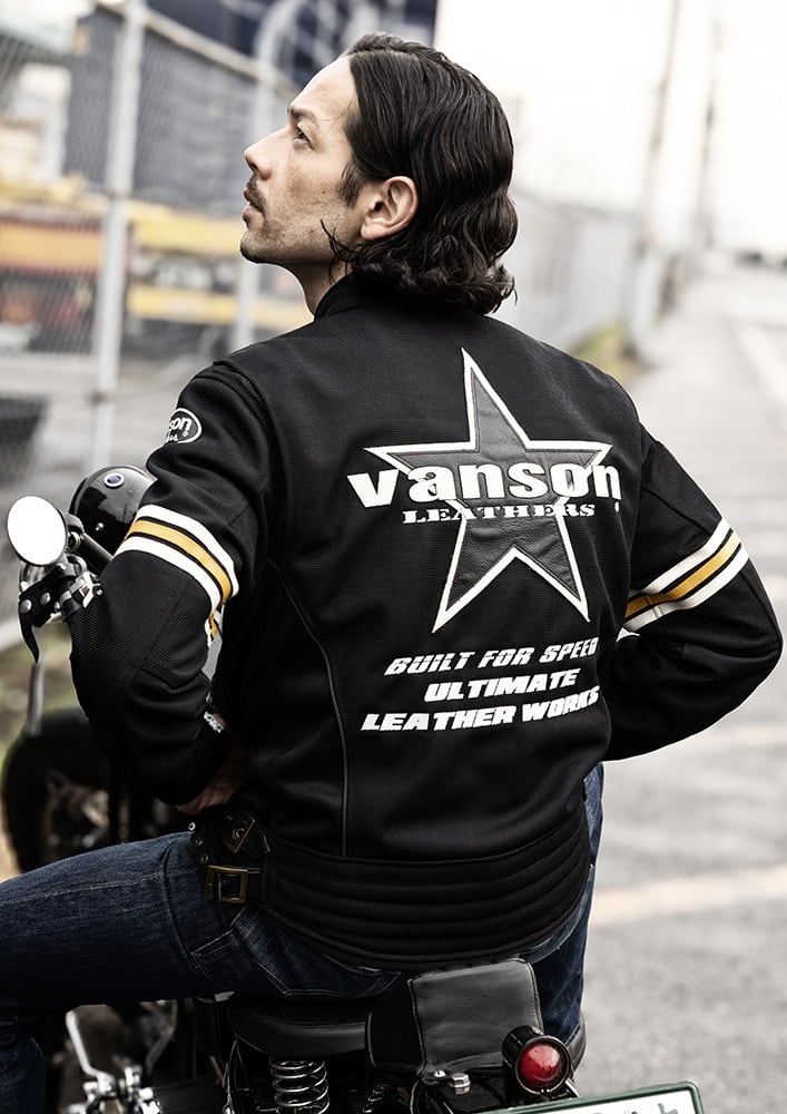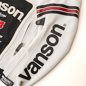 正面・両腕・背中のvansonロゴは、本革切り文字仕上げ。