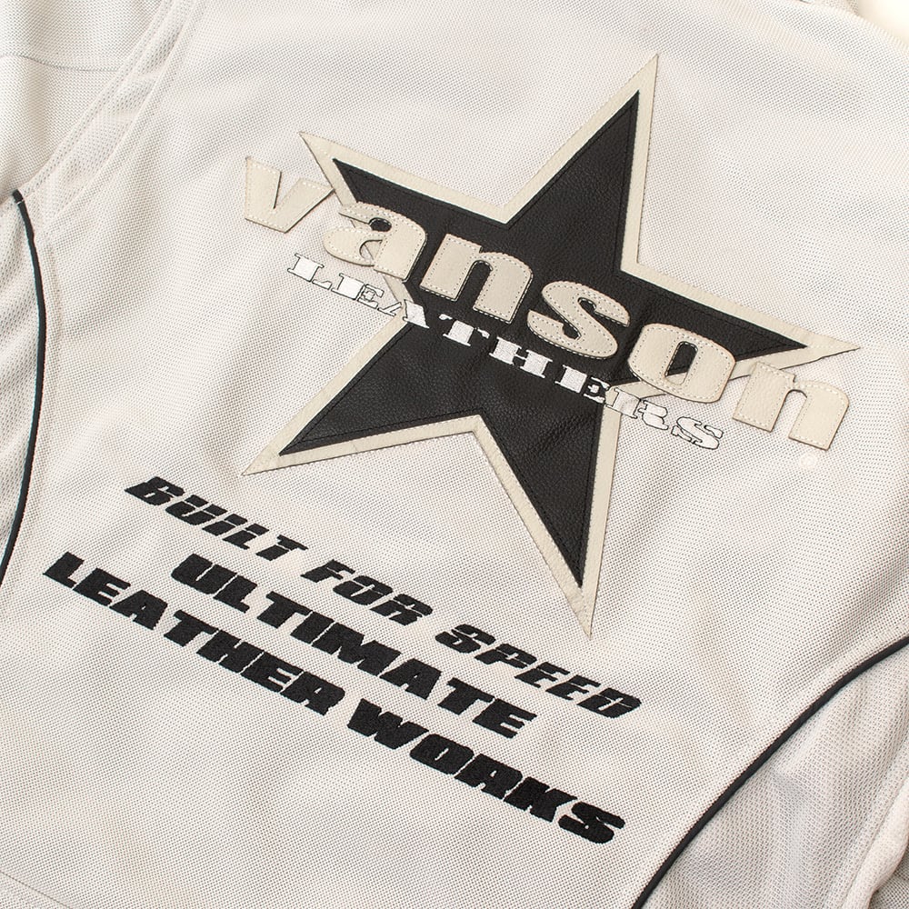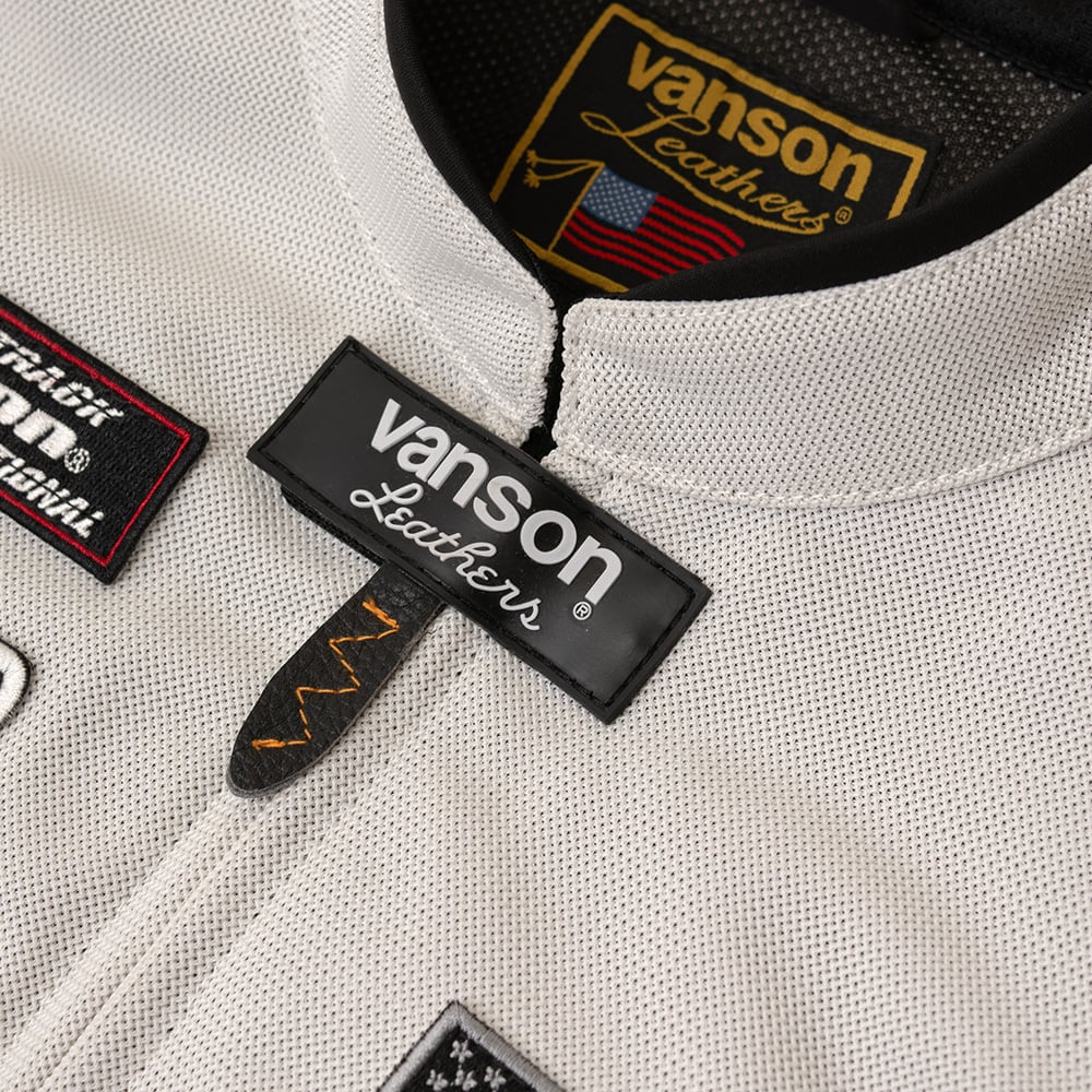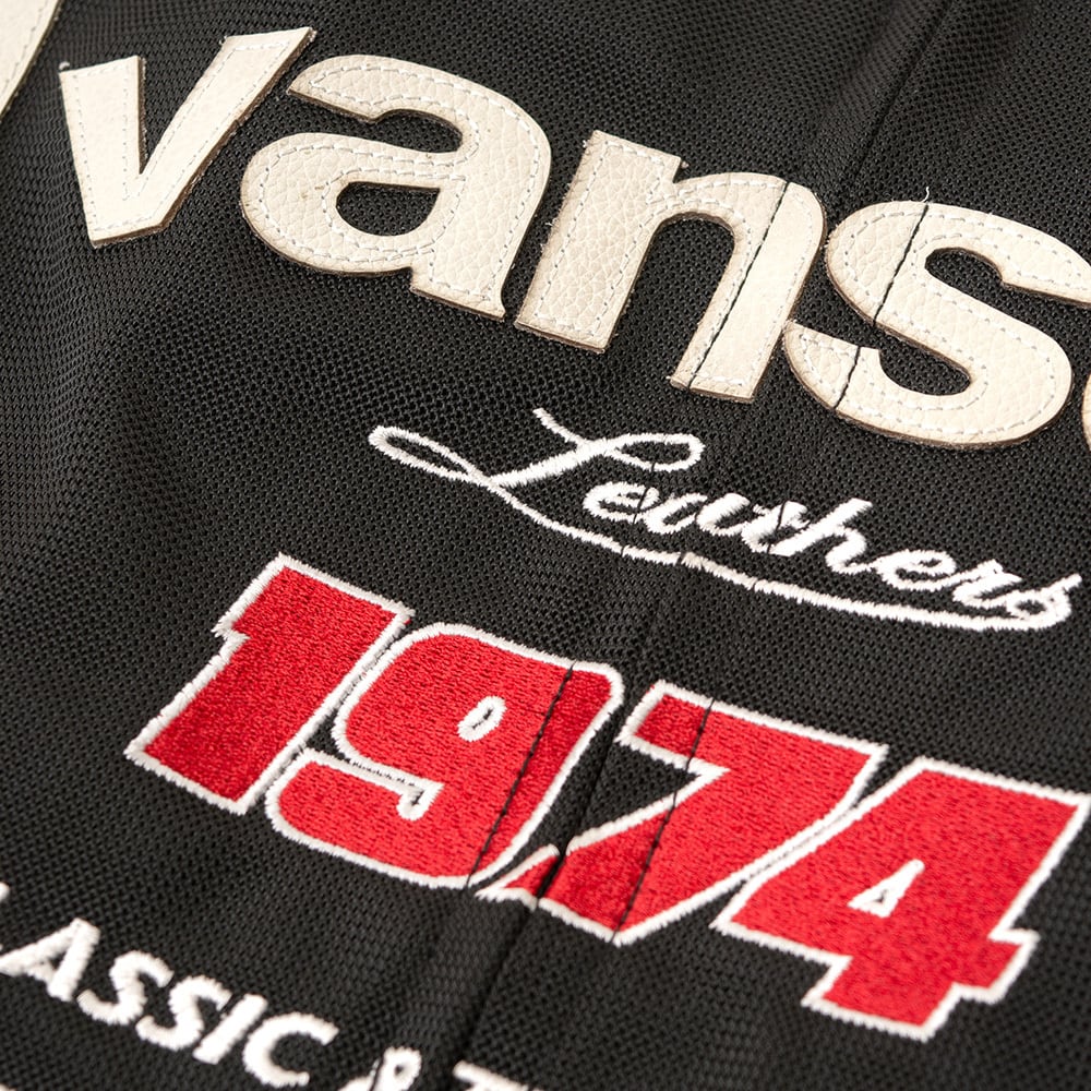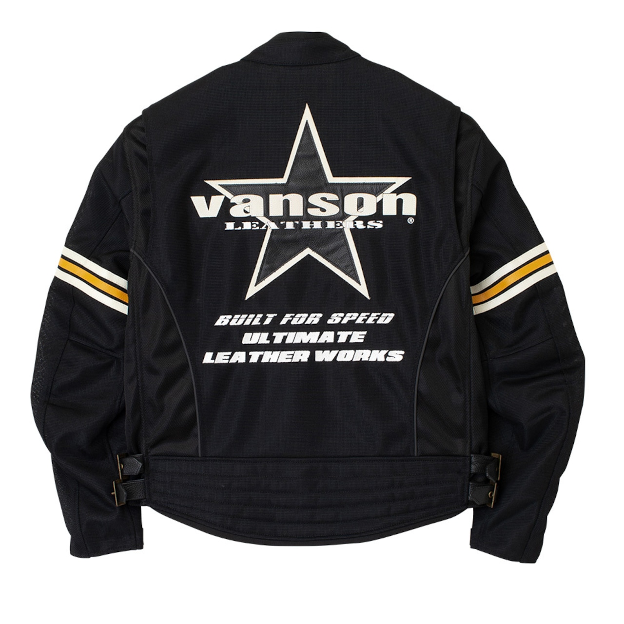 正面・両腕・背中のvansonロゴは、本革切り文字仕上げ。