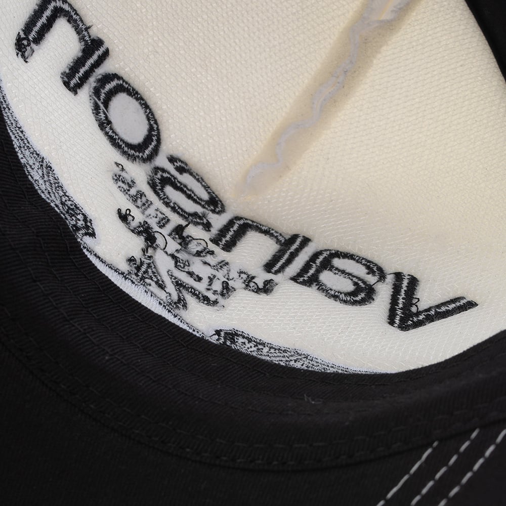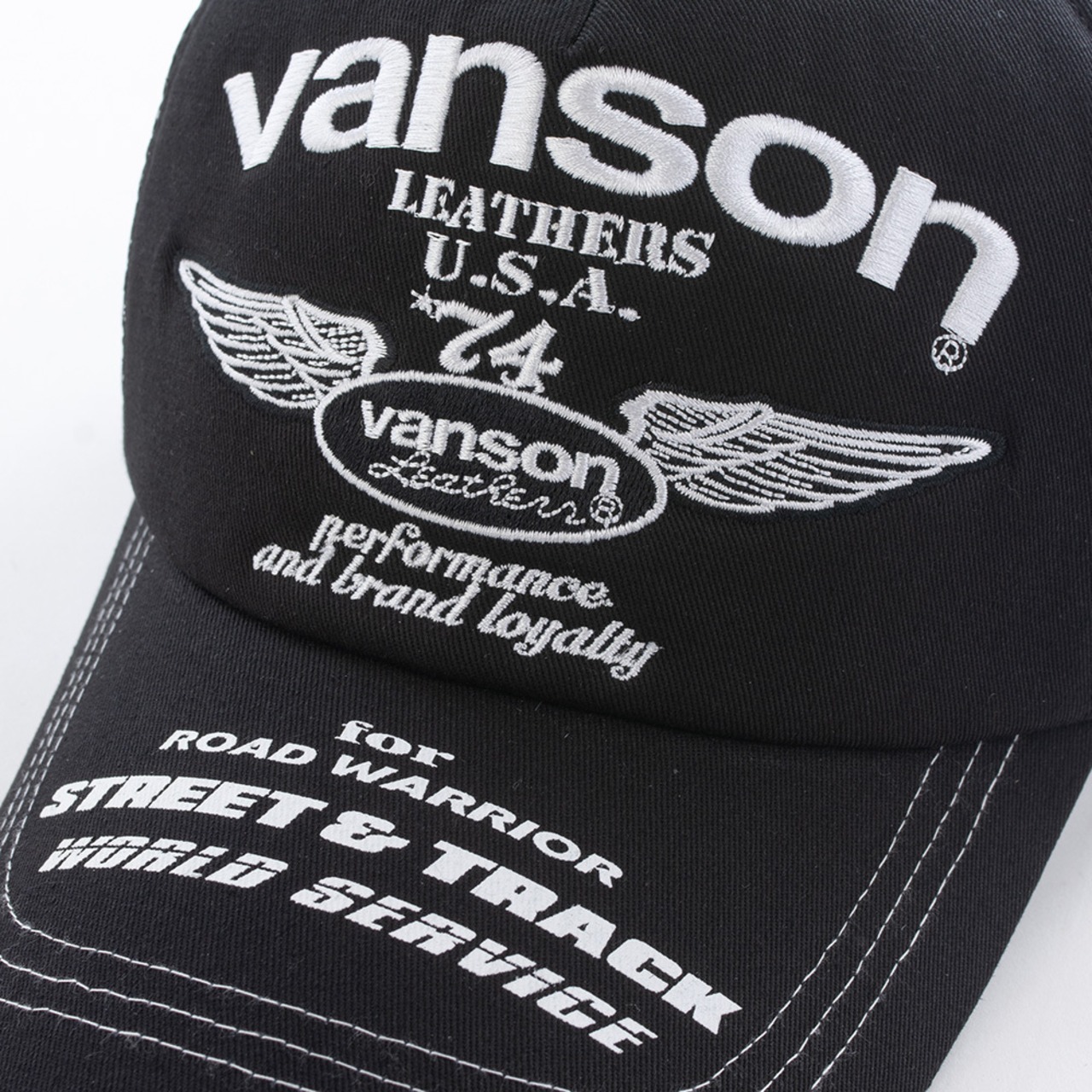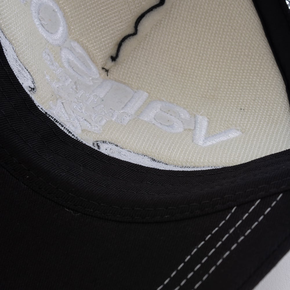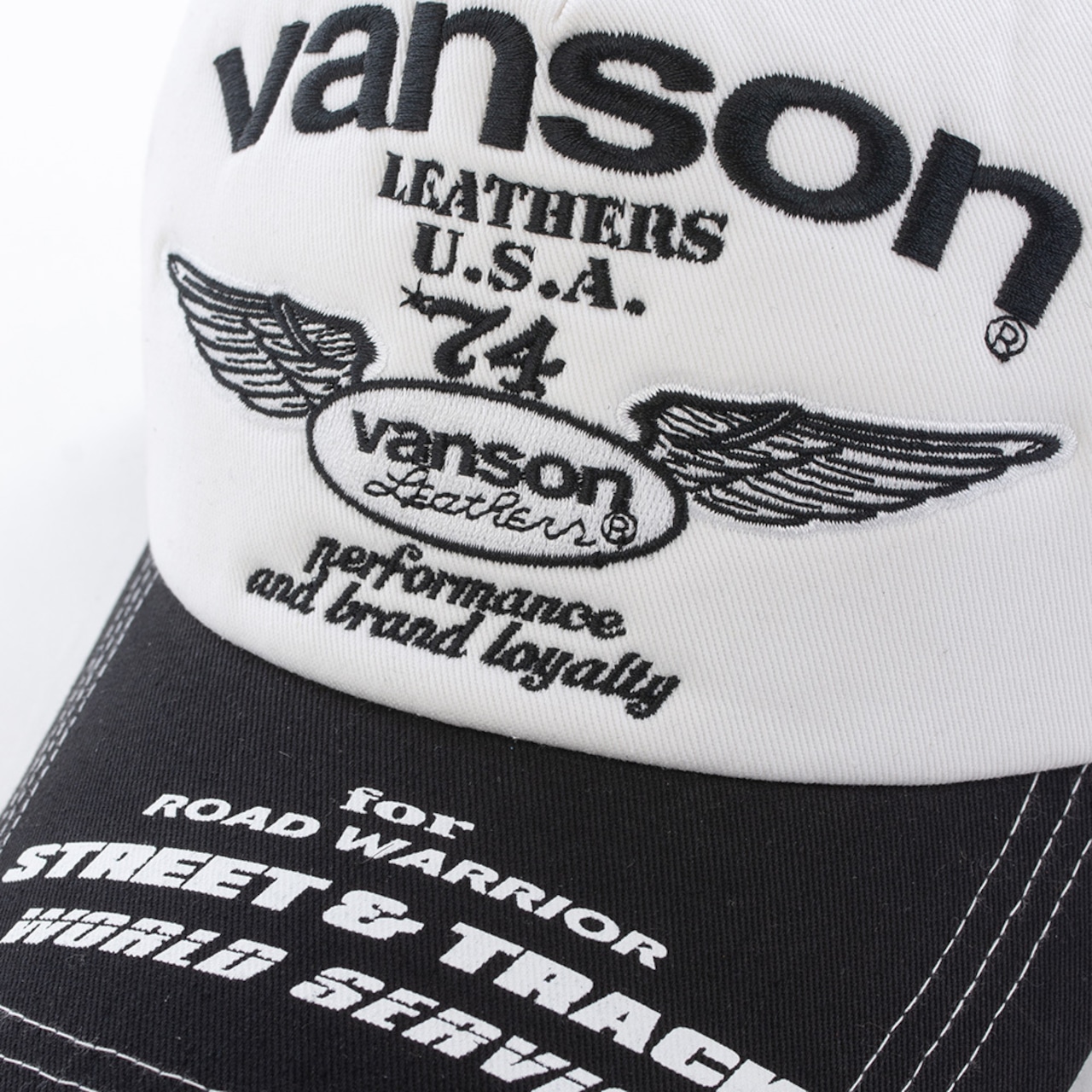 縫い目にホワイトステッチを使用し、前立ては刺繍、つば部分はプリント仕上げ。